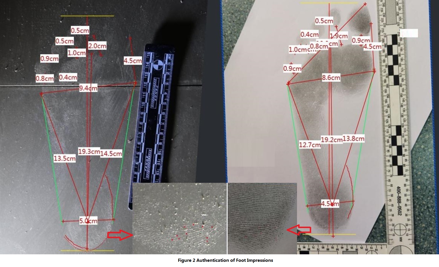 (2) Measuring the distance between two patterns.Identifying and marking the wear characteristics of the two shoe impressions.