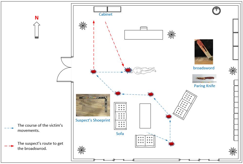 Out of consideration for readers' comfort, live pictures of the crime scene will not be displayed. However, a scene diagram is provided below. This diagram reconstructs the movements of both the victim and the suspect at the crime scene using shoeprints as a reference.