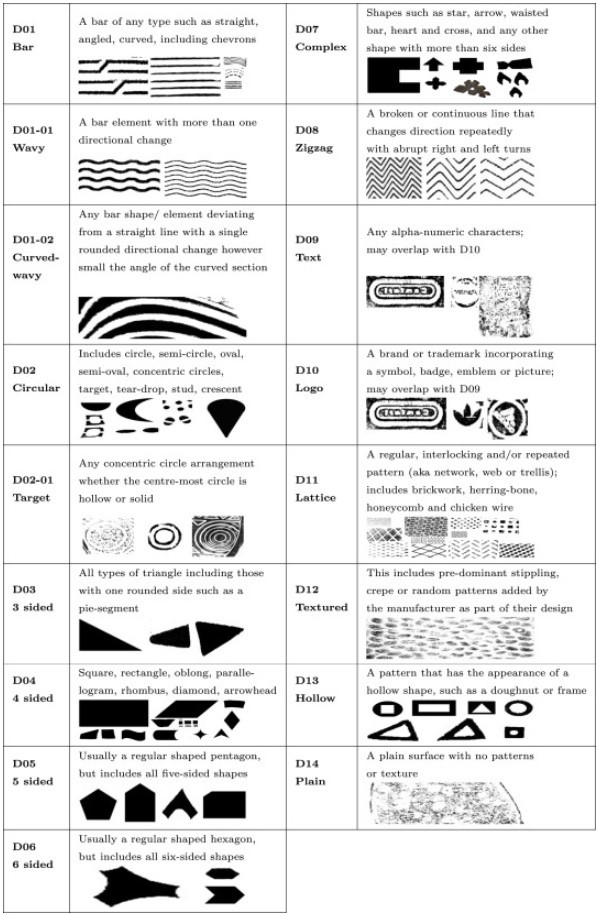 Sol epatterns can be described through graphics and text, and can also be represented by pattern characteristics. After a simple processing, the pattern features of shoeprints can be displayed as a binary image. The shoeprint pattern comparison algorithm can then be used to extract the features from the binary image.