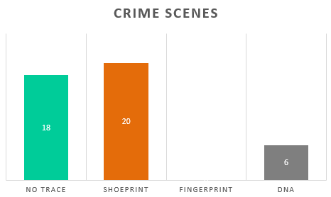 In a series of 44 residential burglariesin Switzerland: 14 events (31%) yielded probative footwear impressions only(i.e., neither probative DNA nor fingerprints were collected from any of these events), six events (14%) yielded both a probative footwear impression and aprobative DNA profile, and no probative fingerprints were obtained from any ofthe 44 events.