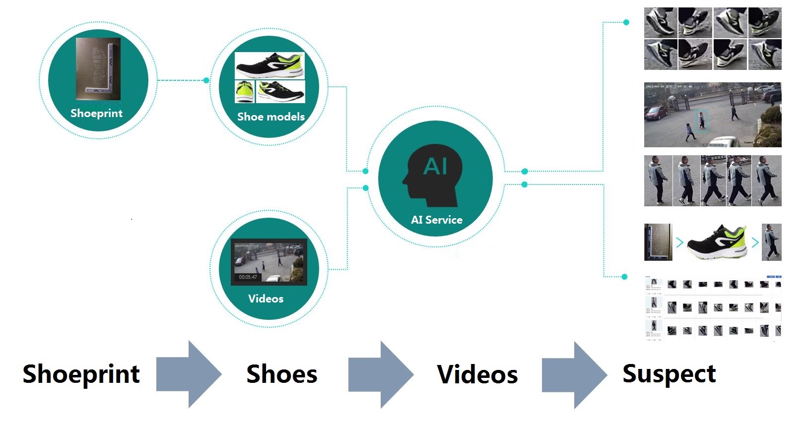 If we could combine the widespread cameras in cities with shoeprint evidence left at crime scenes, identifying suspects would become much easier. After years of research into shoeprint-matching AI algorithms and video-analysis AI algorithms, a complete solution is now available. This solution allows investigators to identify the type of shoe from the shoeprint left at the scene, then use the shoe's characteristics to search for individuals wearing those shoes in video footage, ultimately narrowing down suspects. This solution has already been piloted in several forensic labs and is continually being validated and refined.
